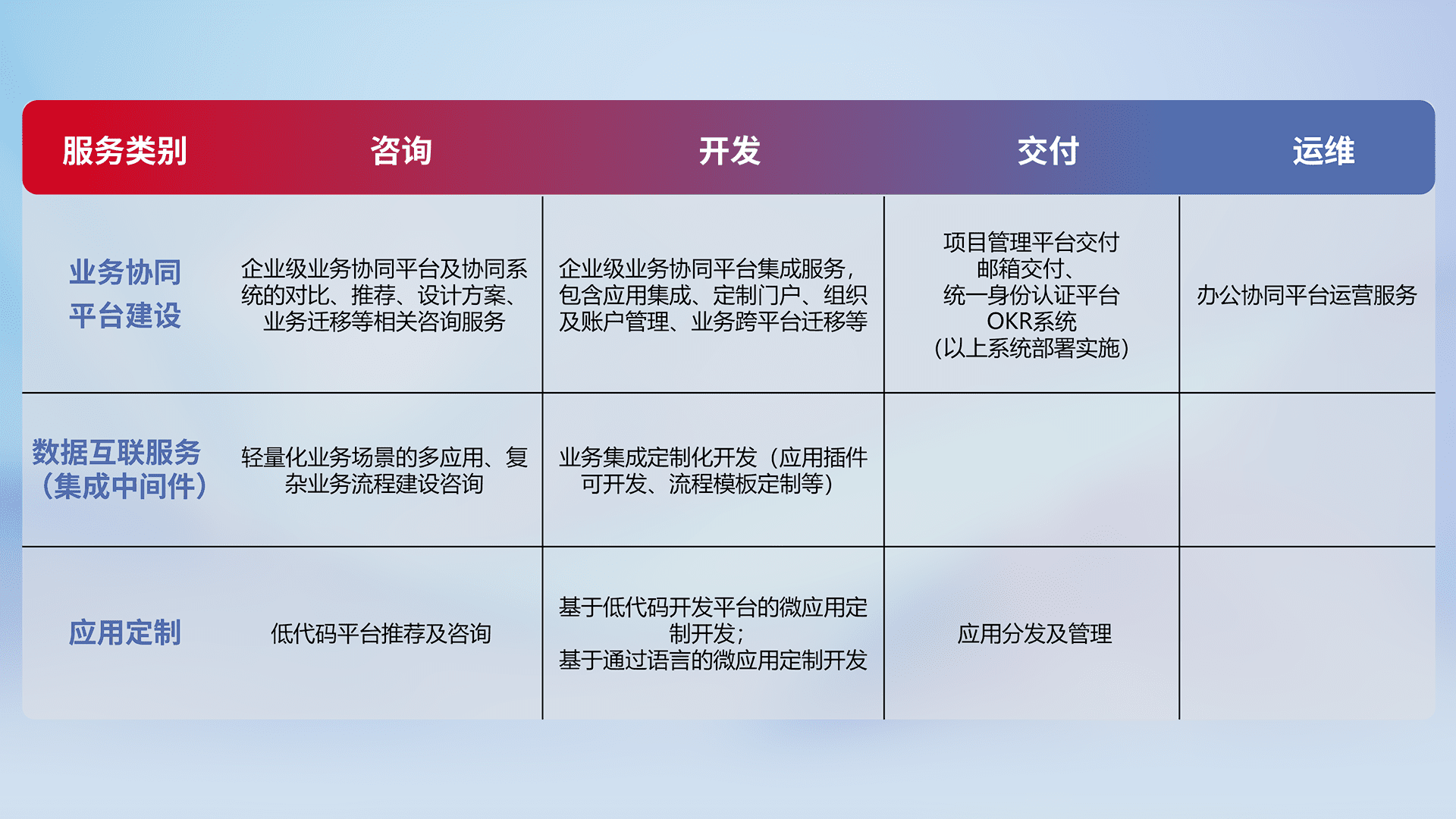 针对钉钉、、企微、、IDaas等平台级产品提供产品的规划、、方案、、、、交付、、、、定制化开发等服务,,,实现如统一协同办公、、、智能客户服务、、、混合会议管理、、、、智能数据查询、、等业务场景,,,实现数字化转型。。